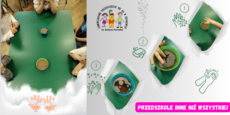 Z okazji Światowego Dnia Mycia Rąk, grupa Tygrysków wysłuchała wiersza poświęconego higienie i czystości rąk. Następnie wspólnie przeprowadziła prosty eksperyment, który pokazał, jak mydło pomaga usuwać brud i bakterie. W trakcie zajęć odbyła się również rozmowa o tym, dlaczego regularne i dokładne mycie rąk jest tak ważne dla zdrowia. Dzieci chętnie dzieliły się swoimi doświadczeniami i utrwaliły prawidłowy sposób mycia rąk. Niniejsze zajęcia odbyły się w ramach realizacji projektu edukacyjnego „Bezpiecznie i zdrowo z Małpką Iwoną”.